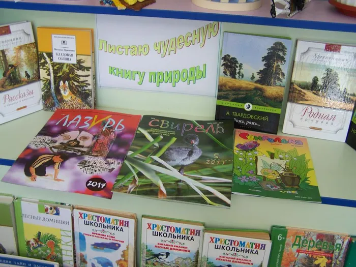 6 июня в Октябрьской библиотеке работает книжная выставка «Листаю чудесную книгу природы» Экспозиция посвящена Году экологии в России. Юным читателям предложены интересные художественные книги, «Лазурь»- популярный литературно – художественный альманах экологической направленности для молодежи, «Свирель» - детский экологический журнал, «Свирелька»- журнал о природе. Все издания с яркими обложками, хорошо иллюстрированы. Конечно же, читатели найдут на выставке произведения замечательных отечественных писателей: Михаила Пришвина, Константина Паустовского, Виталия Бианки, Николая Сладкова, Ольги Перовской, Геннадия Снегирёва. Авторы посвятили своё творчество описанию прекрасного и загадочного мира природы, наполненного притягательными явлениями: щебетом птиц, журчанием ручья, лесными шорохами, необыкновенной красотой и очарованием. Эти книги помогут ребятам понять и почувствовать взаимосвязь и взаимозависимость всего сущего в нашем мире, увидеть во всём удивительное и неповторимое. Из журналов дети узнают об уникальных уголках природы, о самых разных представителях флоры и фауны нашей планеты: о деревьях хвойного и лиственного леса, о полевых и лесных цветах, о разных видах животных и птиц и многом другом.