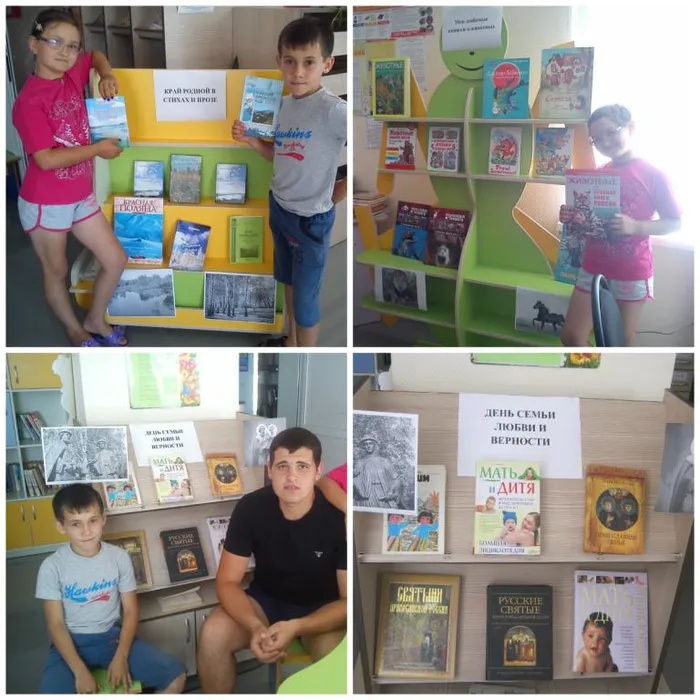 В июле месяце заведующей центральной сельской библиотеки были организованы книжные выставки: 1)Мои любимые книжки о животных 2)Ко дню семьи, любви и верности 3)Край родной в стихах и прозе 4)Книги юбиляры. 140 лет Н.А.Некрасов.,М.Твен.